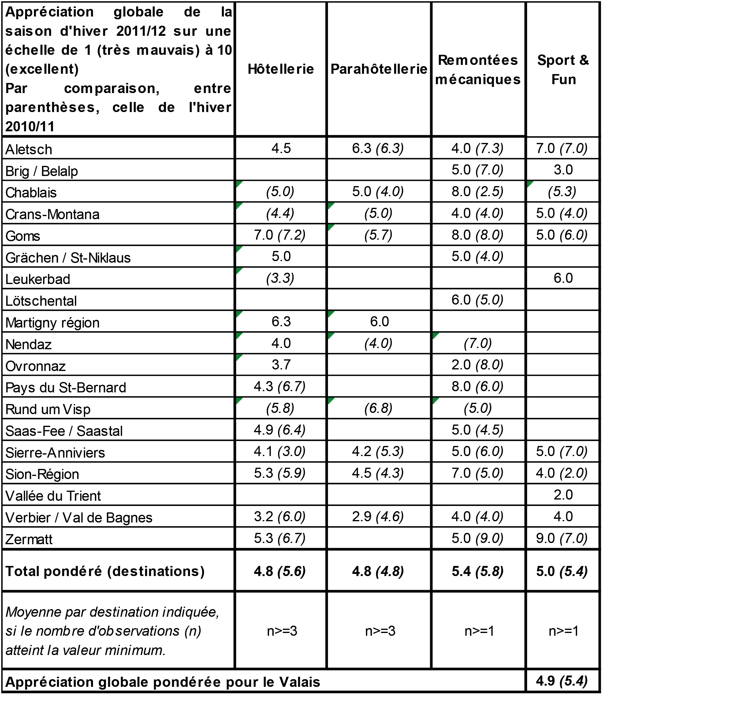 Le tableau ci-dessous indique l’appréciation globale dans les différents secteurs et destinations pour l’hiver 2011/12 et la comparaison avec l’hiver 2010/11 en italique et entre parenthèses. Ce tableau montre que le recul par rapport l’an passé s’est révélé le plus important (0.8 point) pour le secteur de l’hôtellerie. La chute importante de près de 1.5 points des stations disposant beaucoup d’hôtels, telles que Zermatt et Saas-Fee ont un grand poids sur la moyenne. Ces stations influencent donc fortement la chute dans ce secteur. Ces deux stations sont très soumises aux clients de la zone euro et du Royaume-Uni.